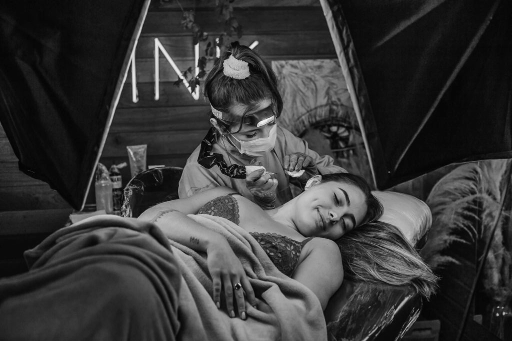 A dor é muito relativa e varia de pessoa para pessoa, mas o traço fino e o pontilhismo costumam ser técnicas mais delicadas. Muitas clientes descrevem como uma sensação suportável, comparada a um leve arranhar na pele.